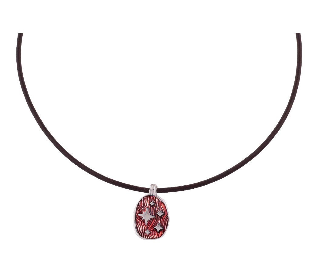 Gargantilla Acapulco en cuero y pieza central bañada en plata alta calidad y esmaltada con esmalte al fuego. Terminada con mosquetón y cadena para ajustarla a cualquier posición. Ideal para cualquier look.