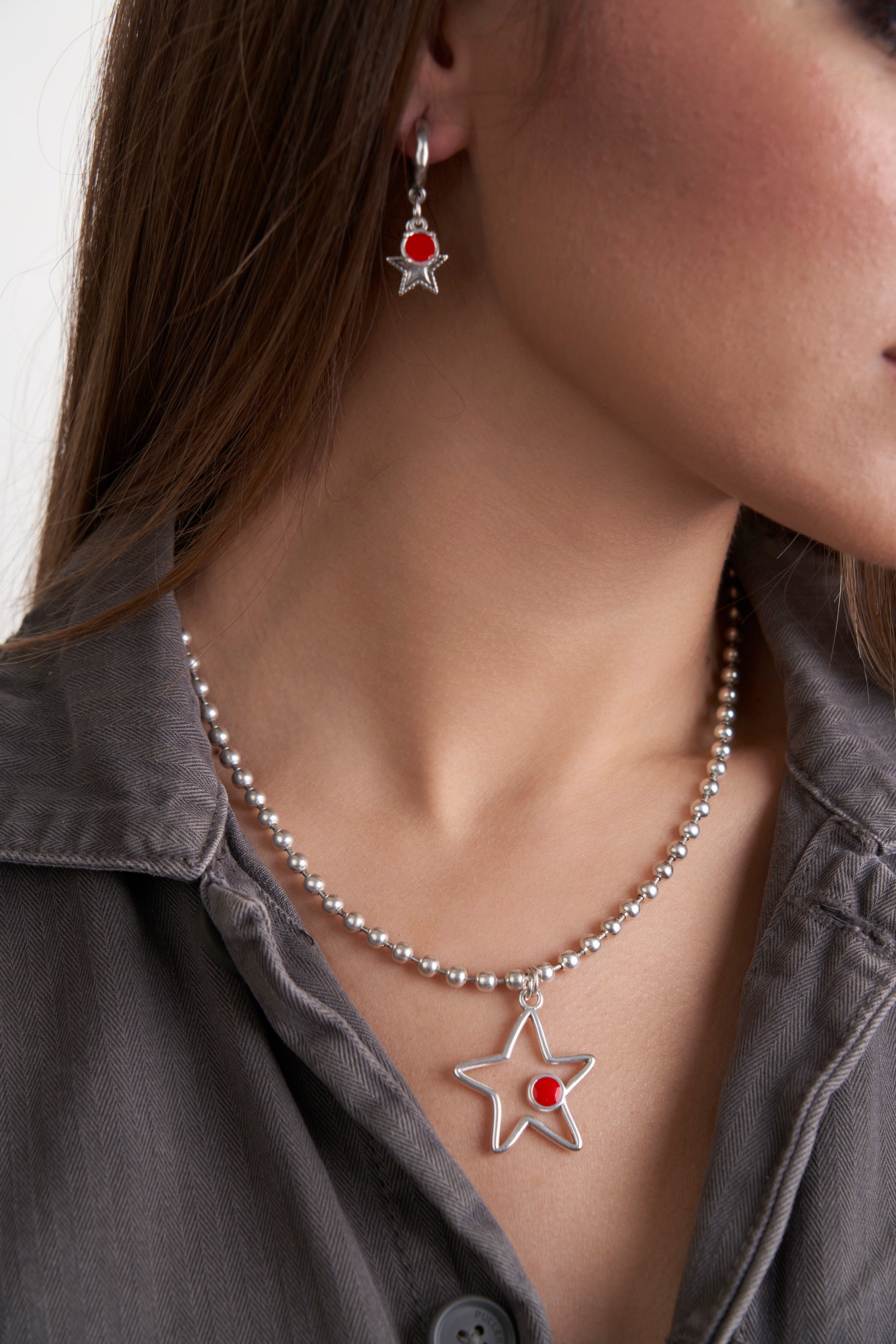Completa tu 'look' estelar con este collar gargantilla de bolitas bañado en plata . Con un diseño idéntico a nuestra pulsera más vendida, este collar de la colección Star presenta el colgante de estrella calada con el toque turquesa y rojo. Es perfecto para llevarlo pegado al cuello Solo o para hacer 'layering' con collares más largos. Una pieza atemporal, fina y llena de luz. ¡No esperes más para tener tu collar de estrella!