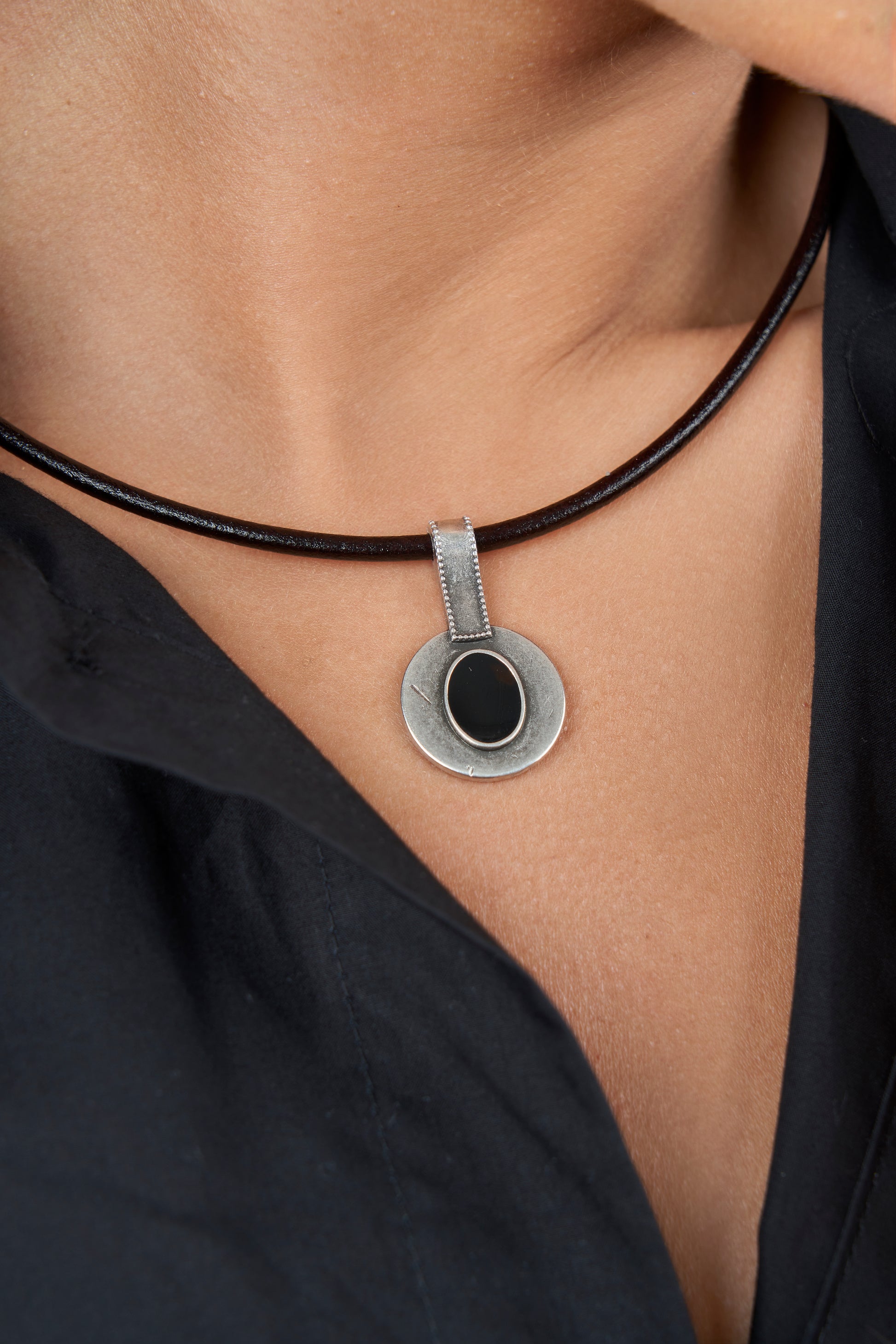 Gargantilla Neón, bañada en plata con esmalte en negro y turquesa. Cuero de alta calidad