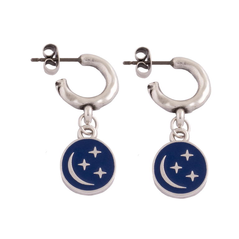 Estos pendientes combinan estilo contemporáneo con un toque simbólico muy especial. Su diseño presenta una aro compacto en acabado plateado envejecido, del cual cuelga una pieza ovalada en azul profundo, decorado con una luan y estrellas en relieve que aporta luz y contraste.